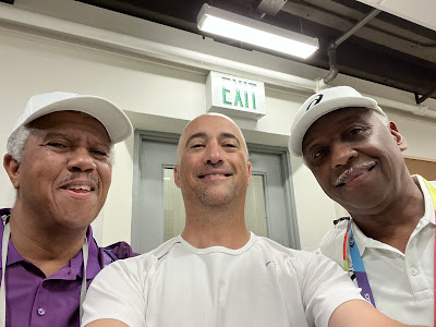 4x400 mixed relay. I’m at the 200m line, and my job is the radio the running order of legs 2 and 3 to the finish line, so the folks there can place the next runners in the right order….the next runner on the first team lines up inside, then the 2nd place runner, then the 3rd….easy peasy, except some of the runners put their numbered bibs right over their country name on their singlets! I can’t read the countries….so I simply call out the colors! I’m brilliant, yes….except that one heat has three teams wearing red.
